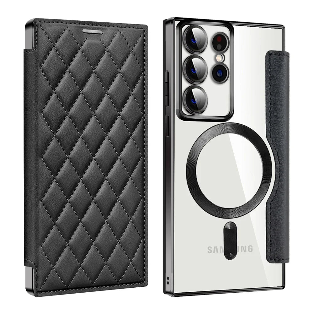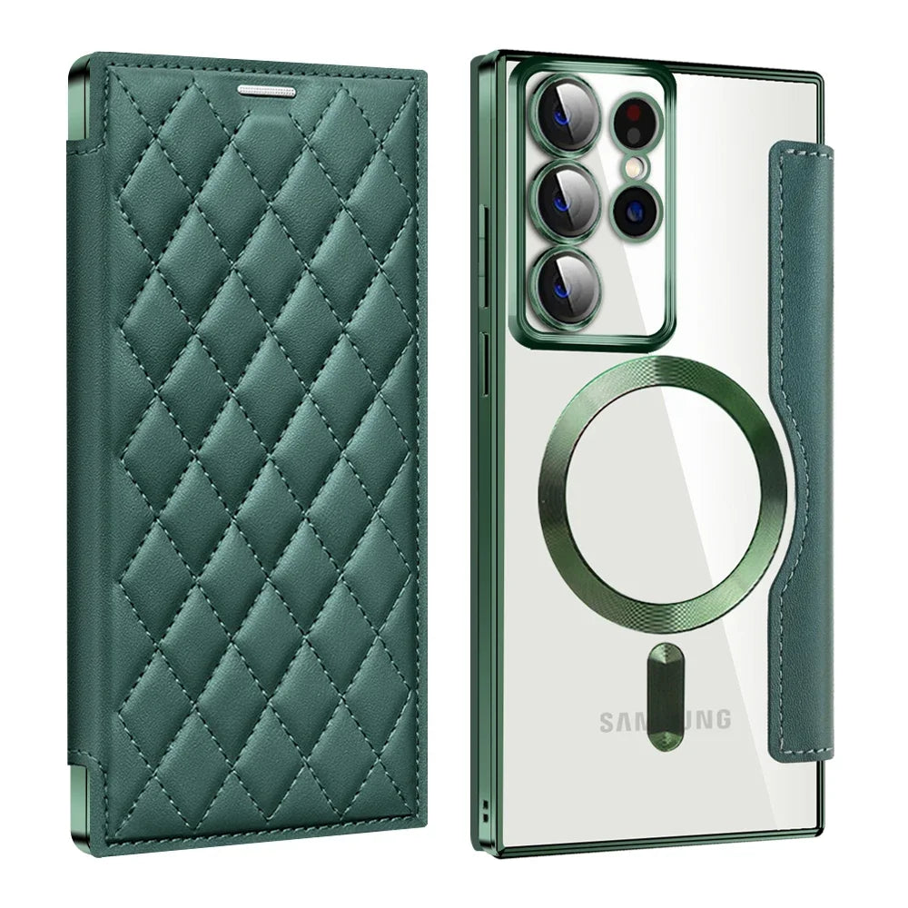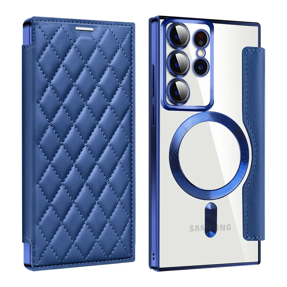 • Gitter- oder Rautendesign mit genähtem Muster umschließt die Hülle und bedeckt und schützt den Frontbildschirm Ihres Telefons