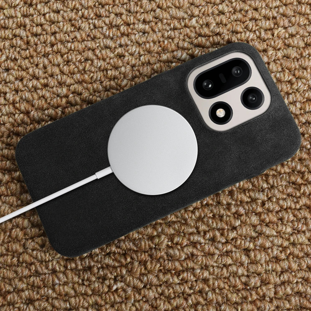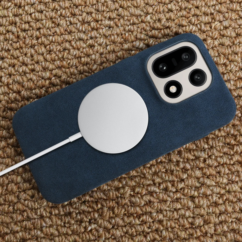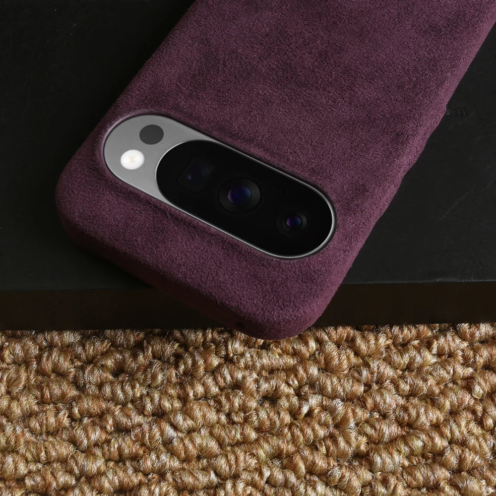 Shock absorbing high quality Alcantara case that is anti-fingerprint. Embedded buttons and precision cutouts for charging port. Great all around protection that protects your phone from dirt, scratches and dust. Excellent fit and feel with comfortable grip. The case is slightly raised to protect the back camera and front screen against flat surfaces.