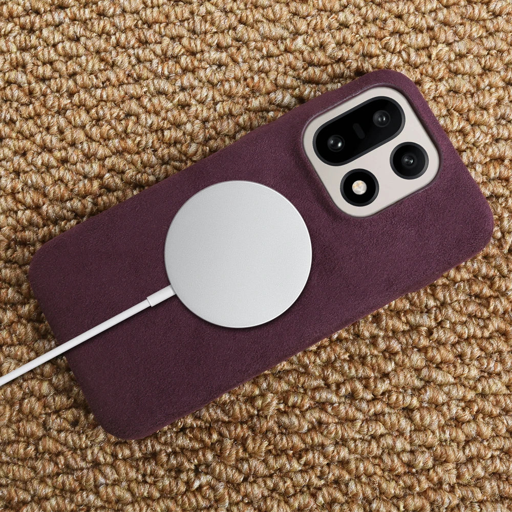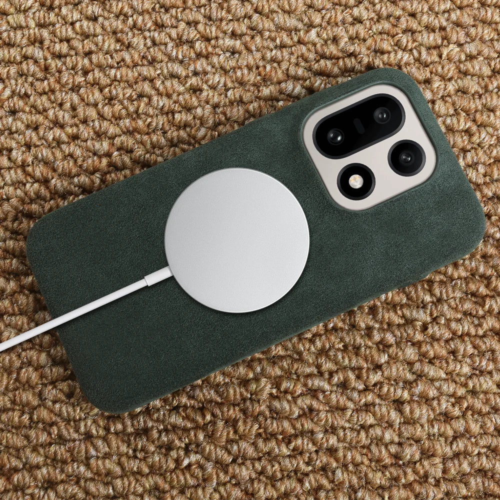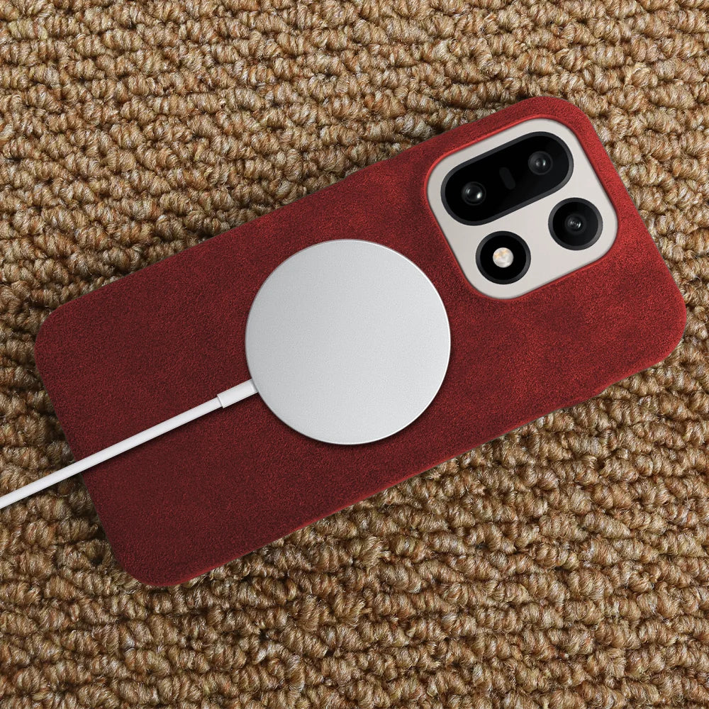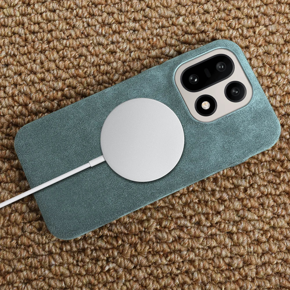Shock absorbing high quality Alcantara case that is anti-fingerprint. Embedded buttons and precision cutouts for charging port. Great all around protection that protects your phone from dirt, scratches and dust. Excellent fit and feel with comfortable grip. The case is slightly raised to protect the back camera and front screen against flat surfaces.